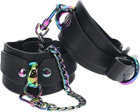 The handcuffs are made from high-quality bonded leather, which is both durable and comfortable to wear. The metal hardware features an iridescent finish that adds a touch of glamour to these otherwise edgy restraints. The handcuffs are adjustable, ensuring a secure fit for all users.