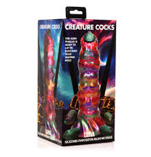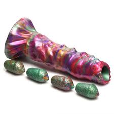 - Fantasy Dildo: This multi-coloured dildo is completely hollow and fits four unique, cocoon-like eggs. The thick rod of the dildo shaft has rows of bumps along one side, ribs along the other, and a variety of texture along the entire shaft. The gland of the head of the shaft has lots of small little bumps that add even more stimulation! Use the ovipositor dildo to insert eggs inside you! Comes with 4 eggs.